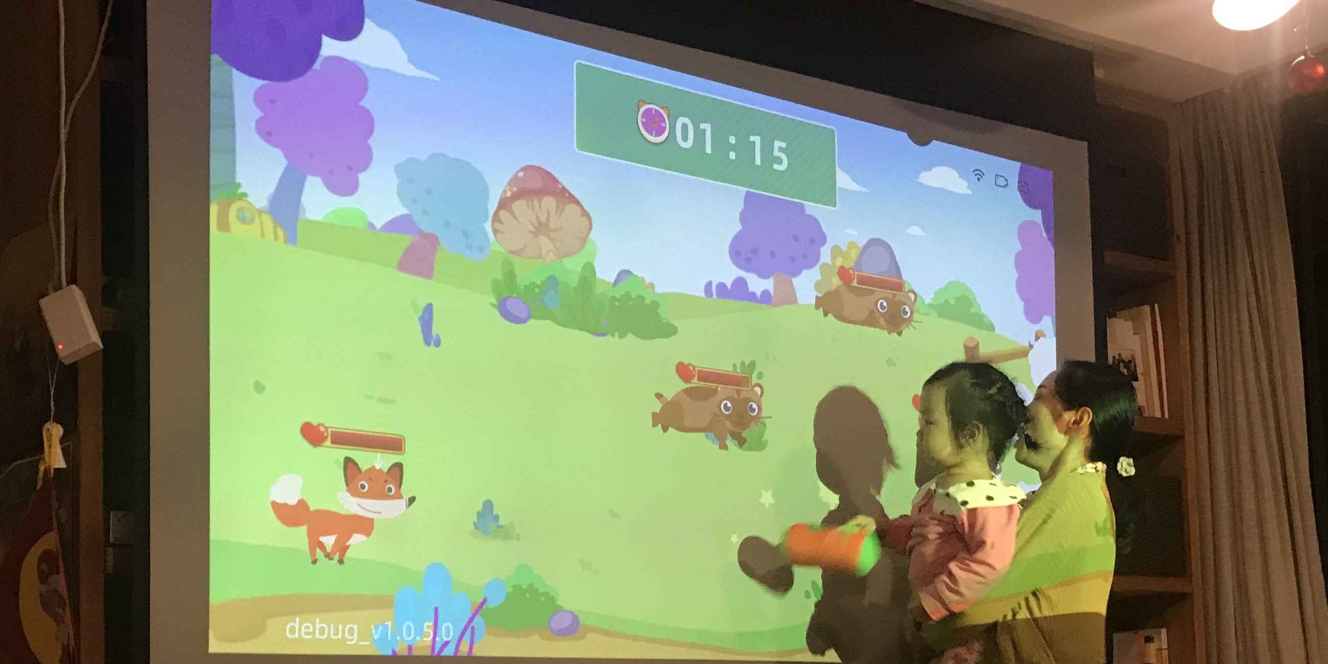 画面一开,小金鱼激动坏了,直念叨怎么还不开始还不开始,我笑她,没看见让你先做热身运动嘛,然后她就很认真的跟着屏幕一动一动,选了一个太空和森林的主题玩,小金鱼玩的很认真,一会用棒子,一会用球砸,玩到满头大汗也停不下来,小孩子的精力就是旺盛!